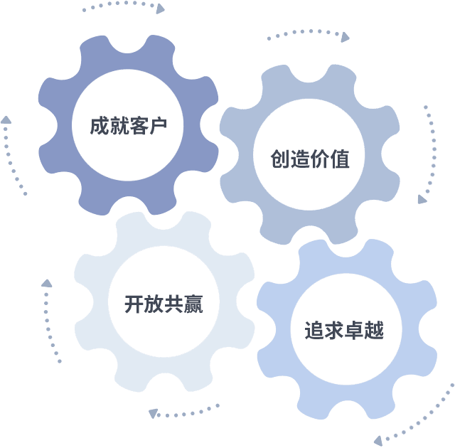 成就客户是一切决策的出发点,,,,创造价值是衡量所有工作的标准,,,追求卓越是我们做事做人的态度,,,开放共赢是我们的格局也是最终的结果。。价值观的齿轮环环相扣,,,,推动着组织里的每个人不断向前。。。